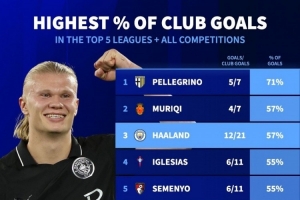 哈蘭德進球占比全隊57%五大聯賽第二高,姆巴佩54%、凱恩47%