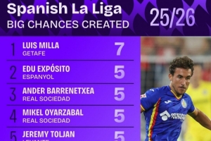 西甲創造進球機會排行:拉菲尼亞、居勒爾4次并列第六