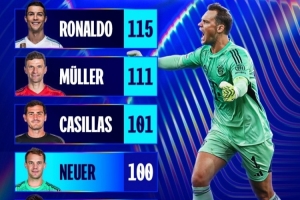目前,諾伊爾在歐冠已經收獲100場勝利,成為第四名做到這一點的球員,在他身前是C羅(115勝)、托馬斯-穆勒(111勝)和卡西利亞斯(101勝)。