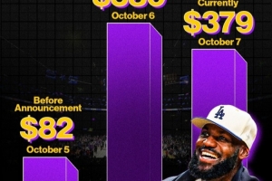 體育資訊10月8日訊 根據二手票務平臺的報道,在詹姆斯發布“決定二”預告前,湖人新賽季最后一個主場最便宜的票價為82美元。而隨著詹姆斯發布預告,最低票價上漲到580美元。