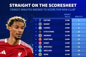 體育資訊10月8日訊 德國轉會市場統計了今夏新援攻入處子球的時間,并排出最快處子球榜單,埃基蒂克4分鐘攻入首球居首。