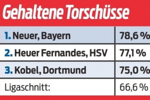 體育資訊10月8日訊 《體育圖片報》統計了本賽季門將在德甲聯賽中的撲救成功率,并列出前三名榜單,拜仁39歲門將諾伊爾以78.6%居首。