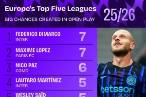 五大聯賽運動戰創造重大機會榜:迪馬爾科7次居首,帕斯6次
