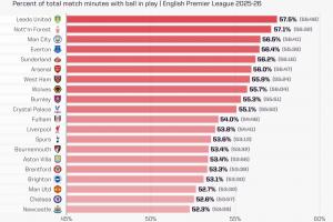 體育資訊10月10日訊 OPTA統計了本賽季至今英超20隊凈比賽時間占據總比賽時間的比率,利茲聯居首,紐卡、切爾西、曼聯倒數前三。