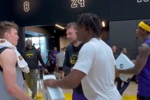 體育資訊10月11日訊 今日,湖人官方Instagram曬出一段昨日東契奇在訓練后向全隊贈送自己的簽名球鞋的花絮視頻。