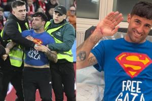 在今天凌晨的世界杯歐洲區預選賽,挪威主場5-0大勝以色列。比賽中有一名球迷沖進球場,脫下外套,展示自己所穿的寫著“自由加沙”口號的T恤。比賽因此被短暫中斷,直到安保人員將其控制住。