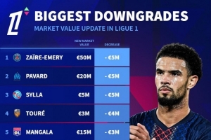 法甲球員身價下跌榜:扎伊爾-埃梅里、帕瓦爾、希拉-500萬歐居首