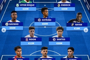 中場:布雷諾-比頓(科林蒂安,1200萬歐)、安德烈-桑托斯(切爾西,3500萬歐)、薩維尼奧(曼城,5000萬歐)、埃斯特旺(切爾西,6000萬歐)、拉揚(yáng)(達(dá)伽馬,1800萬歐)