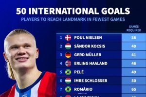 國家隊(duì)最快達(dá)50球所用場(chǎng)次:哈蘭德46場(chǎng)第4、梅西107場(chǎng)和C羅114場(chǎng)