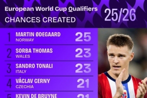歐洲世預賽創造機會榜:厄德高25次居首,托納利23次、丁丁21次