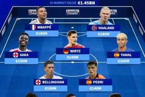 體育資訊10月16日訊 德轉盤點了歐足聯球員的最高身價陣容,整套陣容總價值高達14.5億歐元。其中巴薩小將亞馬爾以2億歐元成為身價最高的球員,姆巴佩、哈蘭德和貝林厄姆均以1.8億歐元并列第二。