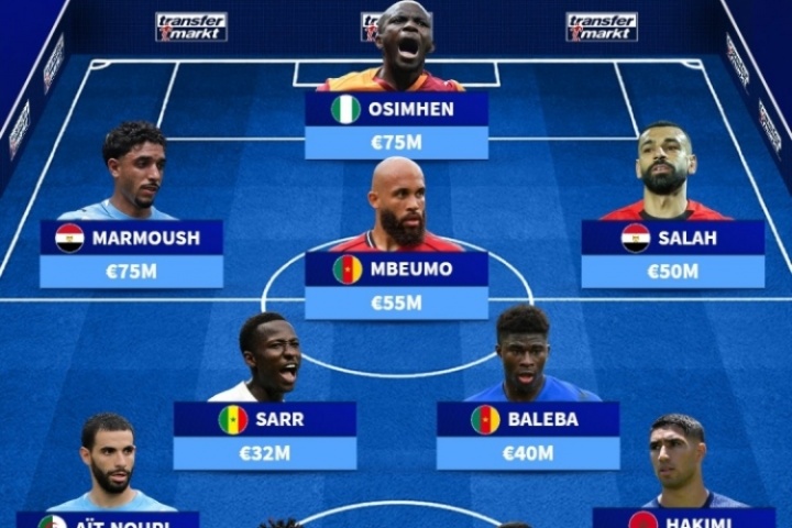 體育資訊10月16日訊 德轉盤點了非洲足聯球員的最高身價陣容,整套陣容總價值高達5.42億歐元。其中巴黎后衛阿什拉夫以8000萬歐元成為身價最高的球員,奧斯梅恩、馬爾穆什以7500萬歐元緊隨其后。