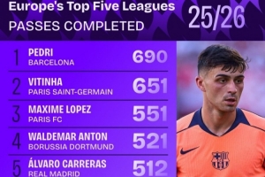 五大聯賽球員傳球榜:佩德里690次居首,維蒂尼亞651次次之