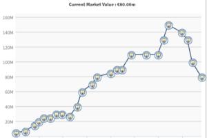 體育資訊10月17日訊 今日德轉更新英超球員身價,25歲福登身價跌出億元,目前為8000萬歐,對比1年前1.5億歐的身價已經腰斬。