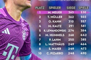 超越穆勒,諾伊爾530場363勝成德甲歷史勝場數(shù)最多球員