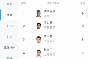體育資訊9月22日訊 中超第25輪昨晚結束,助攻榜方面,本輪貢獻一次助攻的河南隊外援納薩里奧9次登頂,韋世豪、高天意8次。