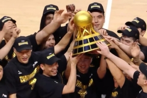 榮耀瞬間!香港金牛籃球俱樂部大比分3-1戰勝長沙勇勝,NBL聯賽兩連冠,球隊捧杯慶祝奪冠。