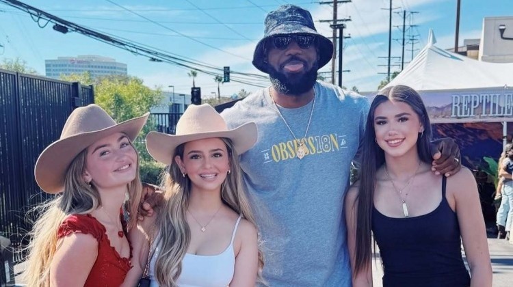 嫂子知道不?詹姆斯參加球隊戶外活動與三位美女合影還俏皮吐舌