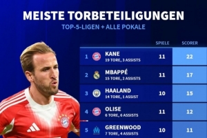 體育資訊10月20日訊 《轉(zhuǎn)會市場》統(tǒng)計了本賽季五大聯(lián)賽球員在俱樂部各項賽事的直接參與進球總數(shù)情況,凱恩、姆巴佩、哈蘭德分列前三。