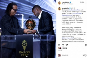 羅納爾迪尼奧社媒曬出頒獎(jiǎng)?wù)掌懙溃骸案兄x金球獎(jiǎng)的邀請(qǐng),今晚留下了許多美好的回憶!恭喜登貝萊和邦馬蒂榮獲金球獎(jiǎng),也祝賀所有獲獎(jiǎng)和入圍的球員們……你們是足球的現(xiàn)在和未來(lái)。”