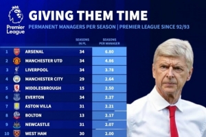 英超各隊歷任主帥平均執教時長:阿森納、曼聯、利物浦、曼城前四