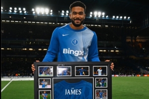 切爾西生涯200場里程碑!里斯-詹姆斯在賽前獲贈紀念球衣并展示