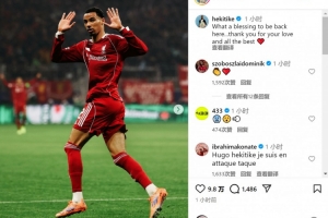 埃基蒂克攻破老東家球門后沒(méi)有慶祝,他在社交媒體上曬出比賽照片,配文:“能夠回到這里真是太好了(上天的恩賜),感謝你們的愛(ài),祝一切順利。”