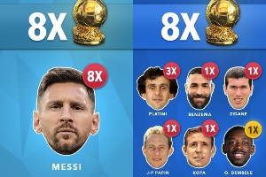1.法國 8次(普拉蒂尼x3 本澤馬、齊達內、帕潘、科帕、登貝萊x1)