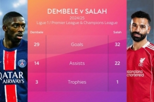 日前,英媒《天空體育》對比了登貝萊、薩拉赫2024/25賽季在聯賽和歐冠的數據。
