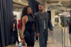 賽后,克萊手牽手攜女友馬冬梅離場。
