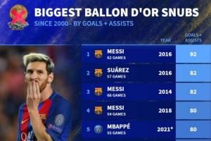 ??無緣金球年份最高進球+助攻數據榜:前4梅西占3席 C羅3度上榜