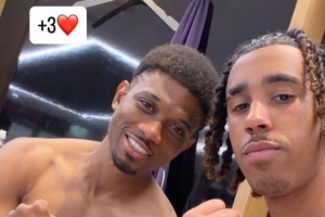 約羅也在賽后通過(guò)社媒曬出自己和阿瑪?shù)略谫惡蟾率页嗦闵习肷淼淖耘恼眨瑑扇丝雌饋?lái)都相當(dāng)開心,約羅還配文道:“+3分”。