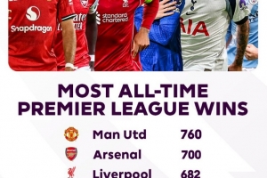英超歷史勝場數榜:曼聯760場居首,阿森納700場次席,利物浦第三