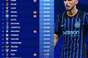 2025-26意甲俱樂部季票銷售排名:國米、羅馬4萬張并列第一