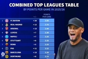 體育資訊10月28日訊 《轉會市場》更新了本賽季五大聯賽球隊的場均拿分情況,拜仁、皇馬、阿森納分列前三。