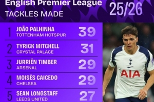 本賽季英超搶斷榜:帕利尼亞壓米切爾居首,廷伯、凱塞多列前四