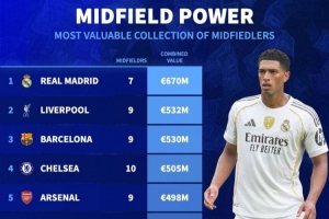 各隊中場球員總身價排行:皇馬6.7億歐居首 利物浦第二、巴薩第三