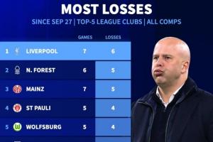 7戰(zhàn)6負(fù)!9月27日以來(lái)五大聯(lián)賽輸球場(chǎng)次:利物浦6負(fù)排名第一