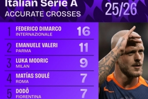 本賽季意甲迪馬爾科16次精準傳中第一,莫德里奇9次排名第三
