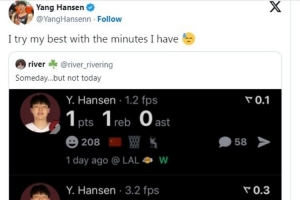 某網友在社媒發文表示賽季至今的5場比賽小楊得分依次是2分、2分、2分、1分、2分,并配文寫道:“我知道他會打出來,但不是現在!”。假冒楊瀚森賬號則在社媒上回復道:“我會在能獲得的時間里用盡全力。”這一回復被“Sporting News”的編輯誤以為是楊瀚森本尊于是他們撰寫了新聞并發出(如下所示)。