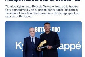 在這里,你正穿著你如此渴望的白色球衣,書寫著你自己的歷史。我們的球迷崇拜你,并將在每一次挑戰中陪伴你。親愛的姆巴佩,這座金靴獎對你來說是繼續贏下去、繼續為皇家馬德里的偉大歷史做出貢獻的又一動力。