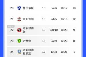 體育資訊11月02日訊 英冠目前已經進行了13輪,目前蘭帕德執教的考文垂積28分,領跑積分榜。