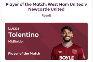 打進世界波,官方:帕奎塔當選西漢姆聯vs紐卡全場最佳球員