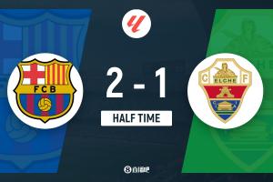 上半場傷停補時3分鐘,半場結束,巴薩暫2-1埃爾切。