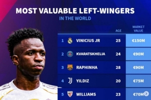 左邊鋒德轉身價排行:維尼修斯1.5億歐居首,K7、拉菲9000萬歐