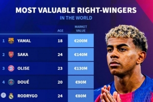 體育資訊11月3日訊 德轉列當前世界足壇右邊鋒身價排行,亞馬爾2億歐居首,薩卡1.4億歐第二,奧利塞1.3億歐第三。
