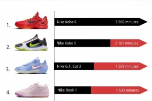 體育資訊11月3日訊 球鞋媒體Kixstats發布了NBA新賽季十月份的球鞋上腳時間排行。前十之中有三雙科比的球鞋,分別排在第一、第二和第五。