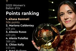 28分優勢!女足金球獎得分:邦馬蒂506分 卡爾登泰478分 魯索420