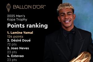體育資訊09月27日訊 金球獎官方今天公布了男子科帕獎的得分細節,其中亞馬爾124分成功衛冕,以52分的優勢領先于獲得72分的杜埃。阿森納小將斯凱利和里爾小將布阿迪未能在評選中獲得分數。