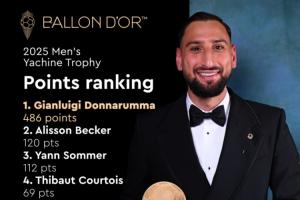 體育資訊09月27日訊 2025年雅辛獎(jiǎng)排名詳情公布,榮獲該獎(jiǎng)項(xiàng)的意大利門(mén)將多納魯馬以486分?jǐn)鄬宇I(lǐng)先,第2名阿利森獲得120分,第3名索默獲得112分。